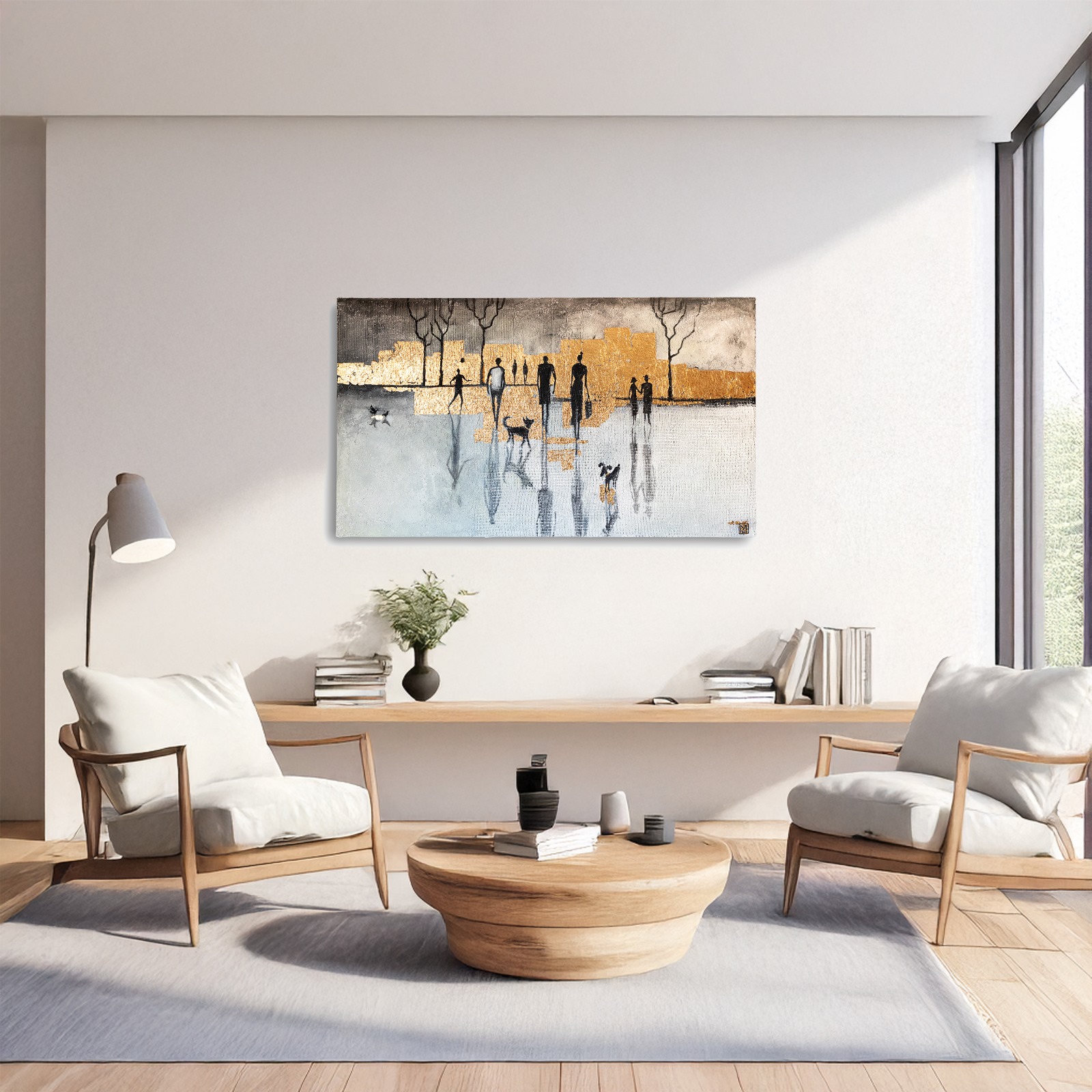 Passi Riflessi è un’opera realizzata in tecnica mista, su base materica in calce, dove si incontrano acrilico, texture stratificate e inserti di foglia d’oro.